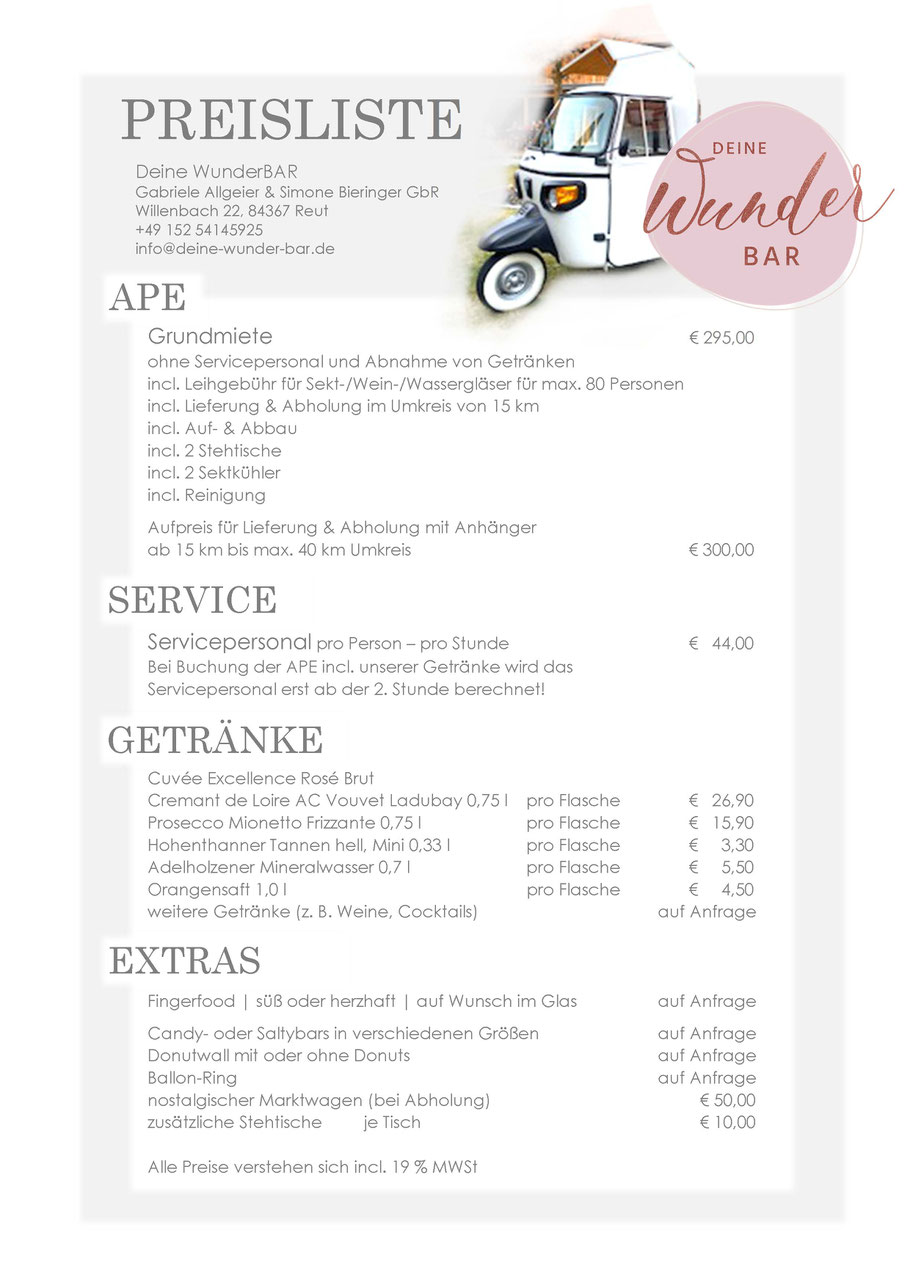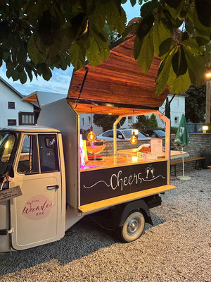 Mit unserer WunderBAR bringen wir, was Du Dir für Deine Feier wünscht: Prosecco, Champagner, Gin, Whisky, Limo, Saft, Bier oder Cocktails. Auch